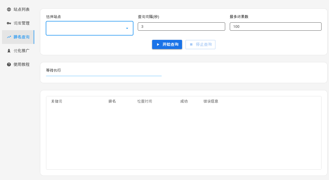 - UI 用 WPF + Material Design,左侧导航把“站点列表 / 词库管理 / 排名查询 / 优化推广 / 使用教程”分开,所有长耗时任务都有取消和进度条,不会把界面卡死。